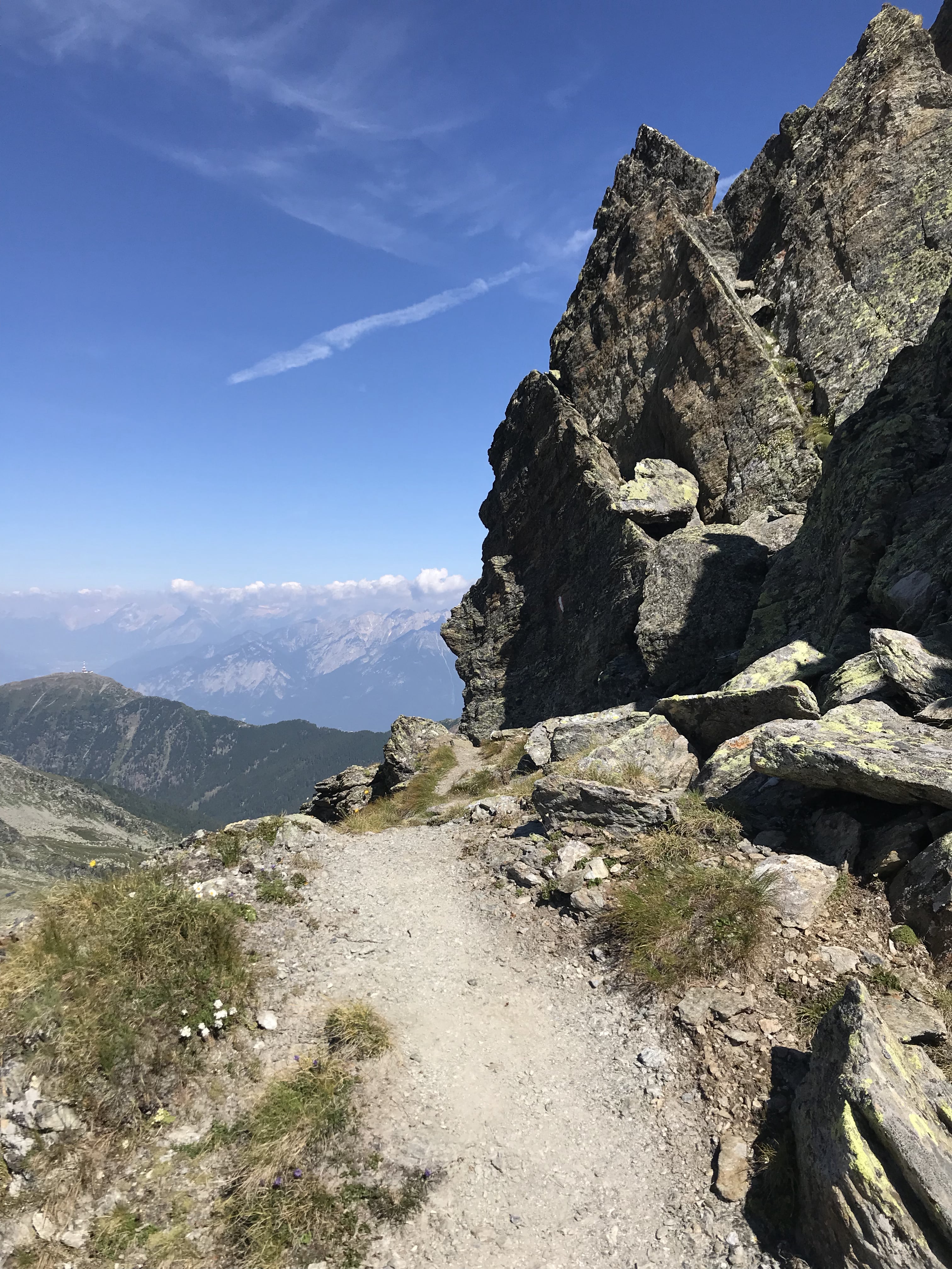 Es gab wegen dem schönen Wetter leider erst etwas später Frühstück auf der Glungezer Hütte als geplant, die Logik erschloss sich uns nicht unbedingt. Danach gab es das Briefing vom Hüttenwirt über das Wetter und die Strecke, die wir zu erwarten hatten. Wir waren die Einzigen, die über den Gipfelpfad später wieder zum Parkplatz Voldererwildbad abstiegen, alle anderen gingen weiter von Hütte zu Hütte. Wir begannen also bei 6°C und herrlichstem Wetter ca. um 08:00 Uhr unsere Tour auf dem Gipfelweg.